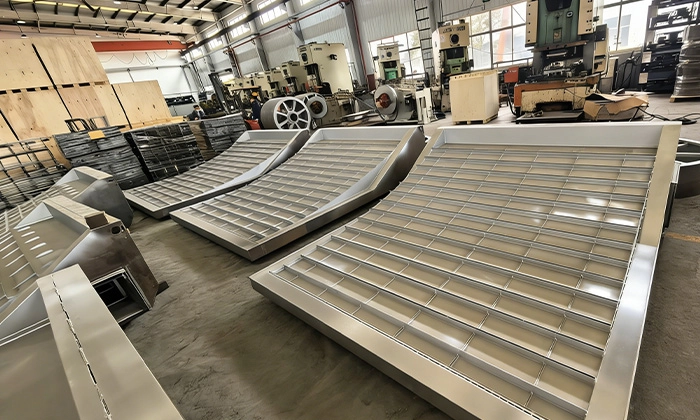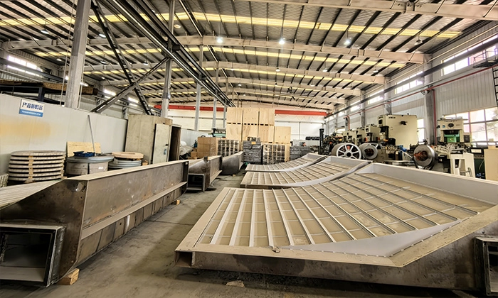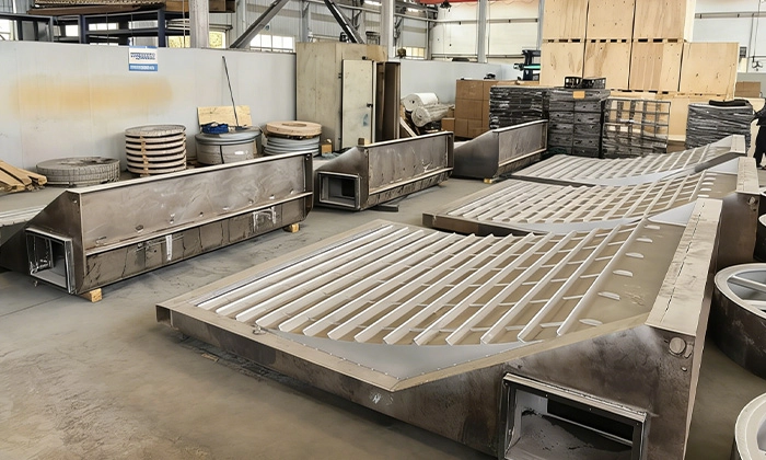 コーティング印刷加工装置用ブローボックス部品名:フレーム 主要部品サイズ:3700*2000*300 mm / 3600*2300*200 mm部品重量:735 kg / 510 kg材質:S275JR、S355J2、E355処理:●熱応力除去(400℃)●サンドブラスト ISO 8501-1 Sa 2½製造工程:材料投入、溶接、機械加工用途:デジタルストリングマシン顧客:Tesmec